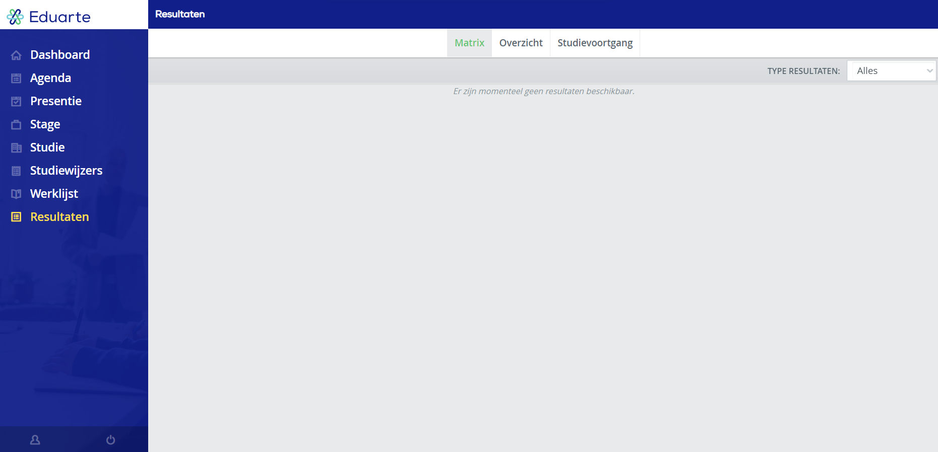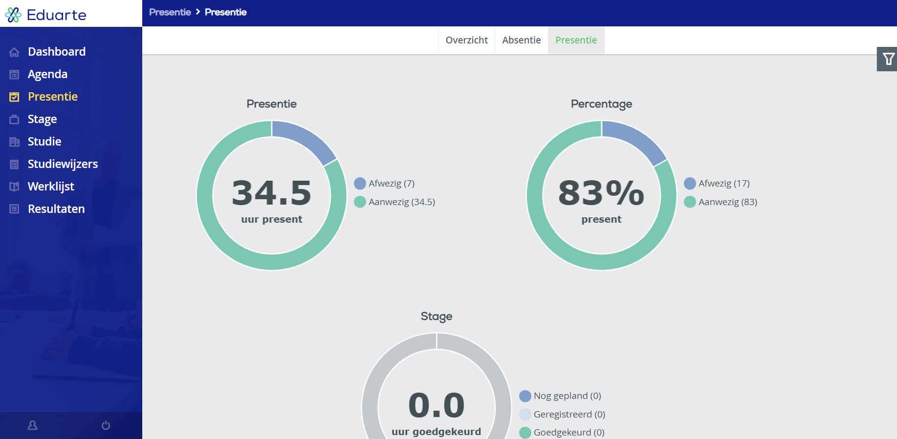 Met eduarte kunt de student zijn rooster, cijfers, groep/klas, zijn stage en de presentie zien
